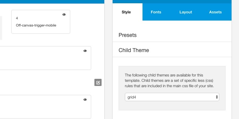 Build.r child themes utilise the Build.r core with the addition of a stylesheet and optional javascript file. The child theme is simply selected in the template admin and the new style information and javascript is included in your template once your template is saved. The Grid4 child theme is a mere 30 lines of code and what you see here on the Grid4 demo is simply a combination of the Build.r core settingswith a little bit of extra style information to match the Grid series design style.