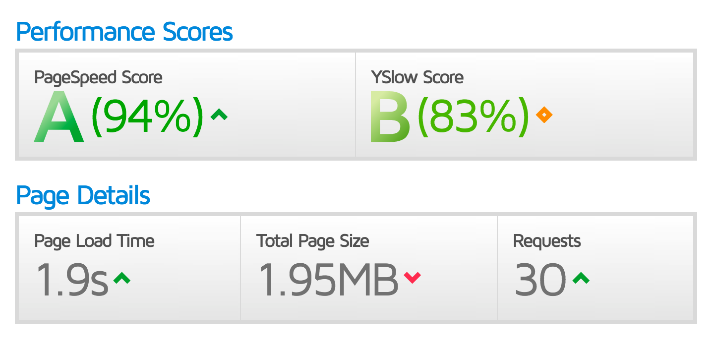The above page speed result was tested on a standard content page on the Grid4 demo, with some small tweaks to the default template settings and our standardised .htaccess file.